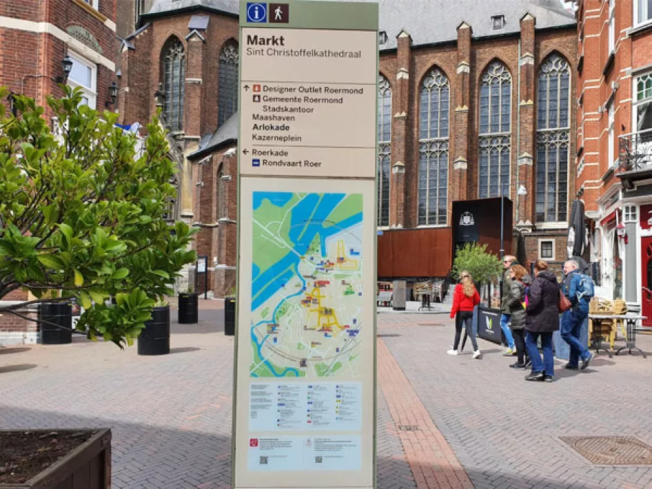 Op alle informatieborden voor toeristen en recreanten in het centrum van Roermond wordt de Archeo Route prominent gepromoot.